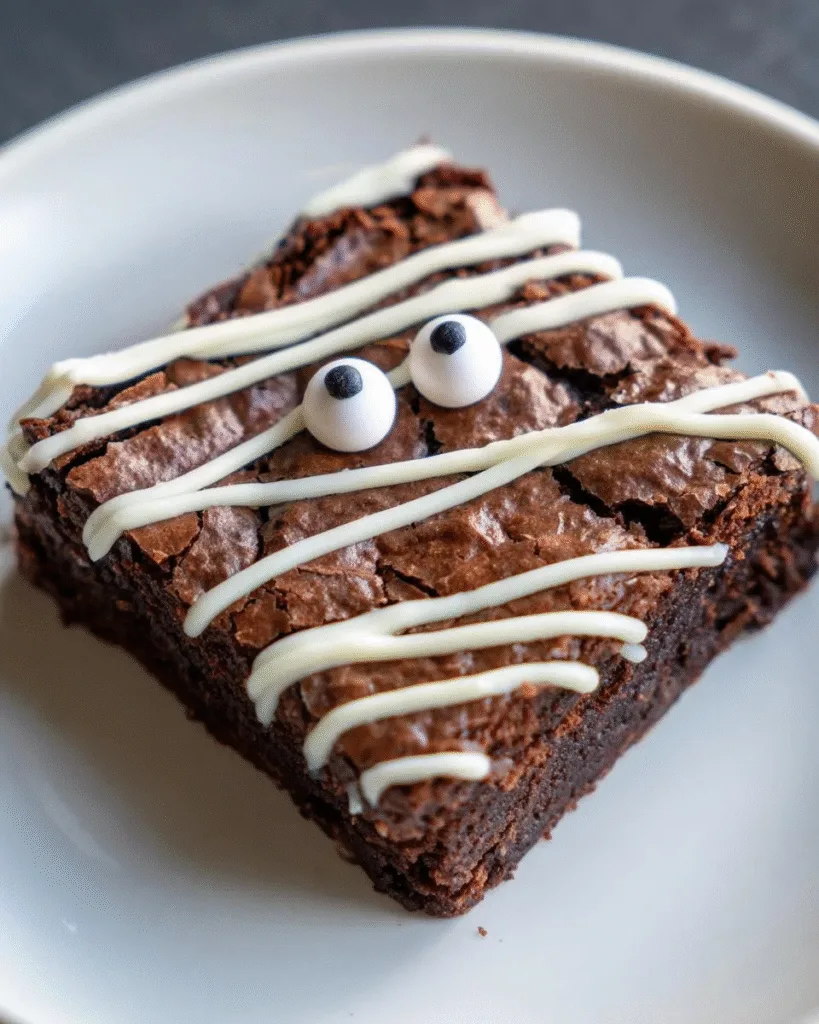 These brownies are more cute than creepy, making them absolutely perfect for kids’ parties. With our Spooky Mummy Brownies Recipe, you’ll use a simple vanilla frosting or melted white chocolate to create the mummy’s iconic bandages. Just drizzle thin lines back and forth across the brownie, leaving a small gap where you can place two candy eyeballs peeking out. We also have a slightly different but equally adorable version, the Mummy Halloween Brownies Recipe, for more mummy fun.