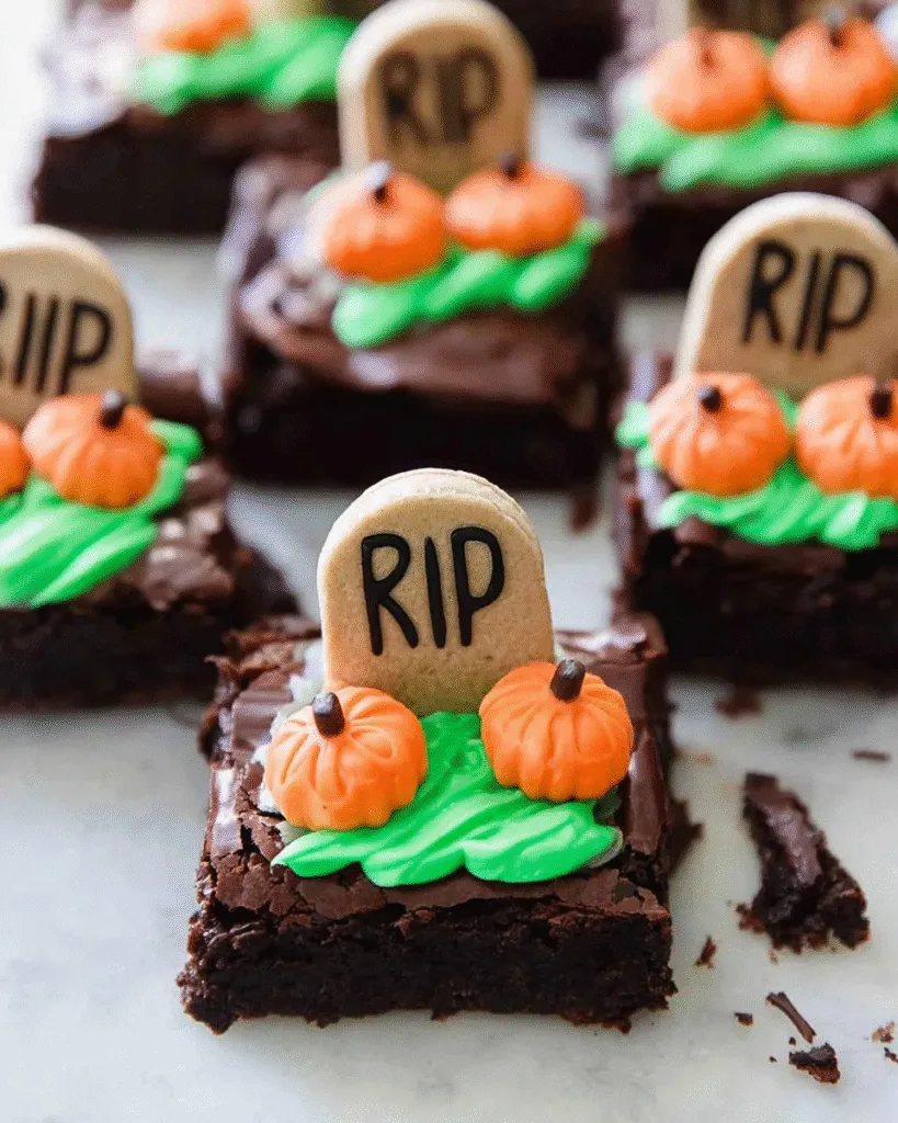 If you’re looking to create a true showstopper, this is the recipe for you. This dessert transforms a simple pan of brownies into a deliciously spooky cemetery scene. The “tombstones” are made from cookies like Milano cookies or shortbread, which you can write on with black icing. Crushed Oreo cookies create the perfect edible “dirt,” and gummy worms can be arranged to look like they’re crawling out of the graves. It’s one of the most imaginative Halloween brownie recipes and is guaranteed to get a gasp (of delight!) from everyone who sees it.