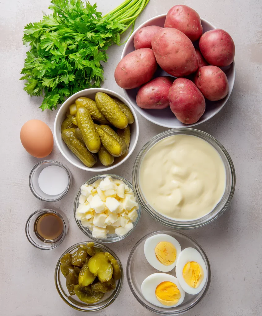 When you think of American Potato Salad, a few ingredients instantly come to mind—and they’re exactly what makes it a comforting classic. Whether it’s your grandma’s handwritten card or the top-rated recipes sources, the key players are always the same: waxy potatoes, mayonnaise, mustard, vinegar, and a fresh crunch element like celery or pickles.