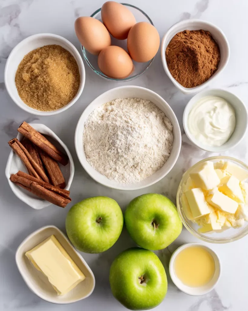 Before you start, make sure you’ve got everything ready on the counter—because once you mix the batter, this recipe moves fast. Here’s what you’ll need for the ultimate apple crumb cake: