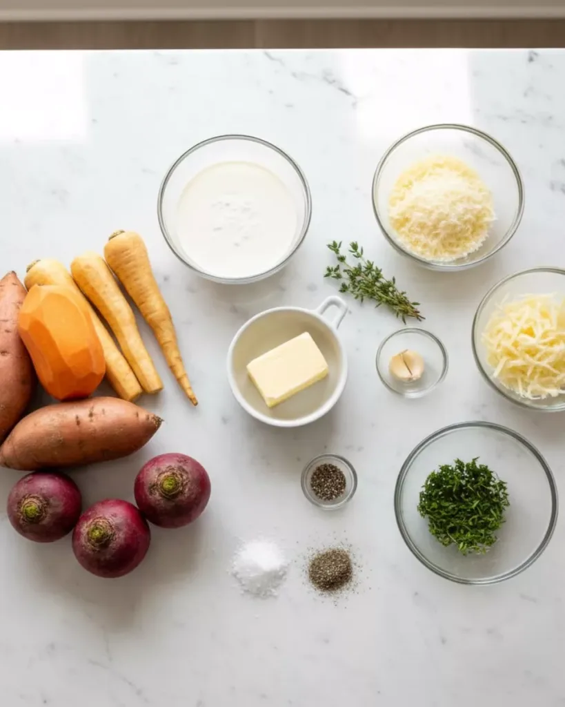 A creamy and cheesy gratin made with layers of sweet potatoes, parsnips, and beets, baked to perfection with Parmesan and gruyere cheese.