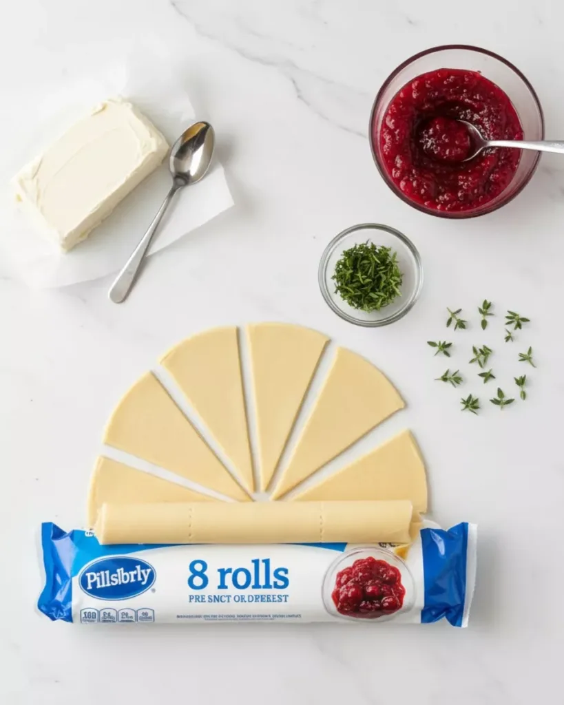 - Add 1 tablespoon of cream cheese on the widest end of each triangle. Top with 1 heaping teaspoon of cranberry sauce and a small pinch of thyme. Repeat for the remaining rolls.