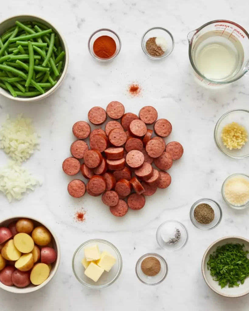 First things first – let’s get everything ready. Slice your kielbasa into those perfect 1-inch pieces (I like to angle my cuts for more surface area). Trim the ends off your fresh green beans – snap them if you’re feeling rustic! Then halve those baby potatoes (no need to peel – the skins add great texture). Chop the onion and mince the garlic while you’re at it. Trust me, doing all this prep at once makes the rest a breeze.