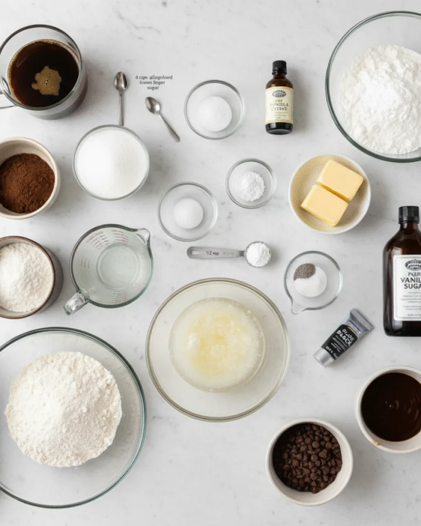 - 1 cup hot coffee: Don’t skip this! It enhances the chocolate flavor without making the cake taste like coffee.