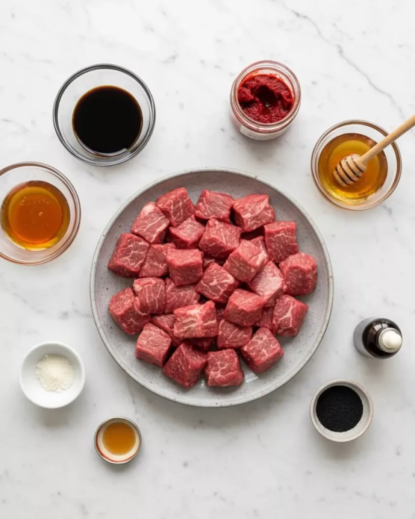- 1 lb beef steak – I use flank, skirt, or New York strip cut into those perfect 1-inch cubes (pro tip: pop the meat in the freezer for 15 minutes before cutting – makes slicing so much easier!)