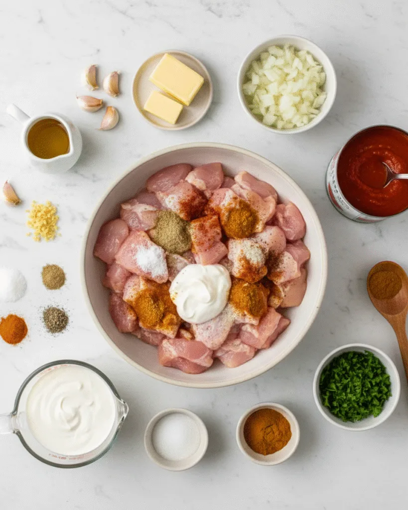 Same pan, add the remaining butter – oh yes, we’re building flavors here. Toss in your onions and garlic, stirring until they’re soft and fragrant (about 2 minutes). Now pour in the tomato sauce, followed by all those glorious spices – sugar, salt, pepper, cayenne, garam masala, and curry powder. Stir well, then slowly pour in the heavy cream while stirring constantly. Let it bubble gently for a minute or two until slightly thickened.