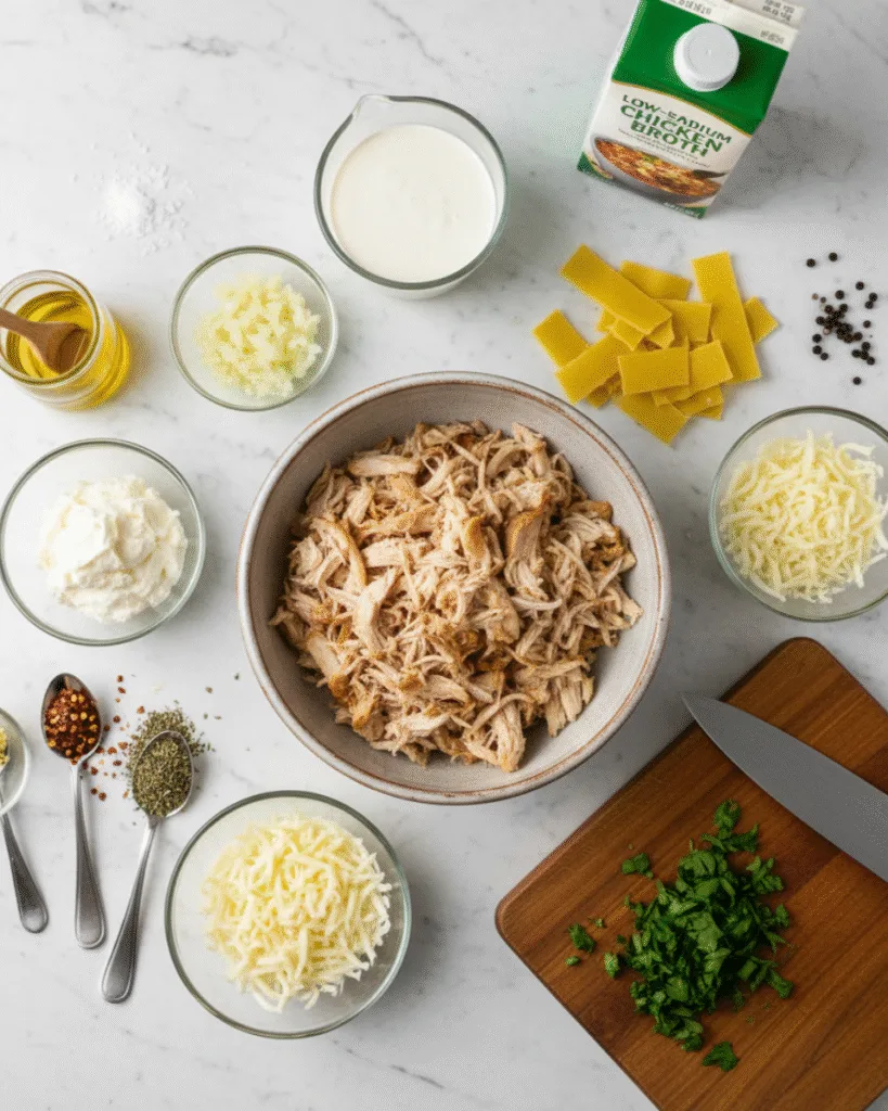 What I love about this White Chicken Lasagna Soup is how humble ingredients transform into something extraordinary. Here’s everything you’ll need – and trust me, these measurements matter for that perfect creamy texture!
